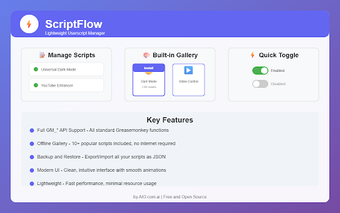 ScriptFlow is a powerful userscript manager designed specifically for Chromium browsers, enabling users to run custom JavaScript on any website. This free tool includes a built-in offline gallery that hosts over 10 popular scripts, allowing for quick access to commonly used functionalities. With full support for the Greasemonkey API, users can easily implement features such as saving and retrieving values, adding custom styles, and more, enhancing their browsing experience.